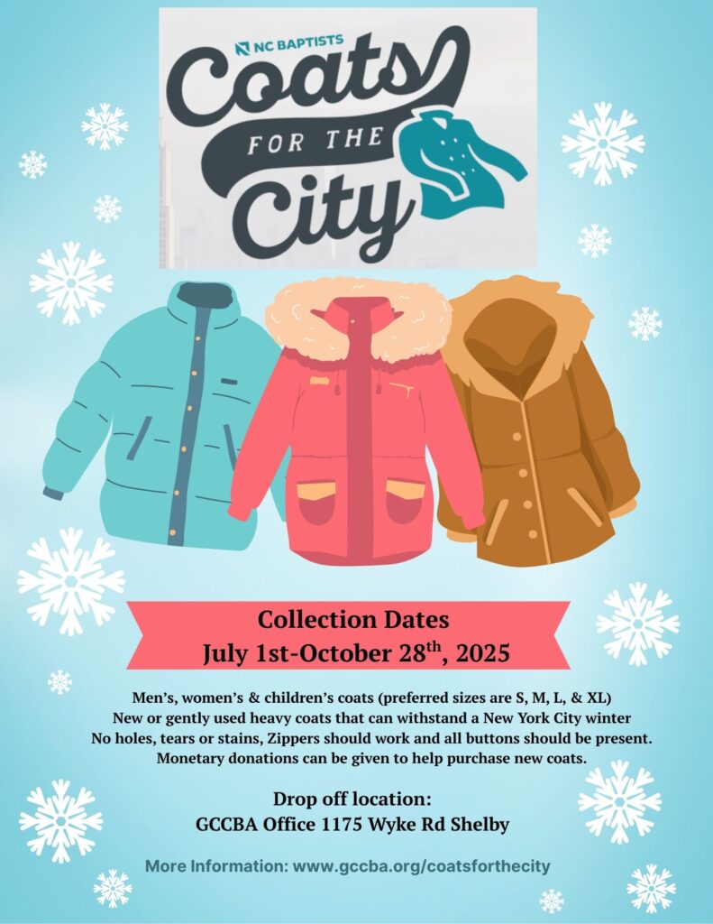 N.C. Baptists are on mission together as the hands and feet of Jesus by collecting coats throughout the year and distributing them to those in need in New York City. Join with others as we partner with South Carolina Baptists and the Metropolitan New York Baptist Association in this incredible service opportunity.